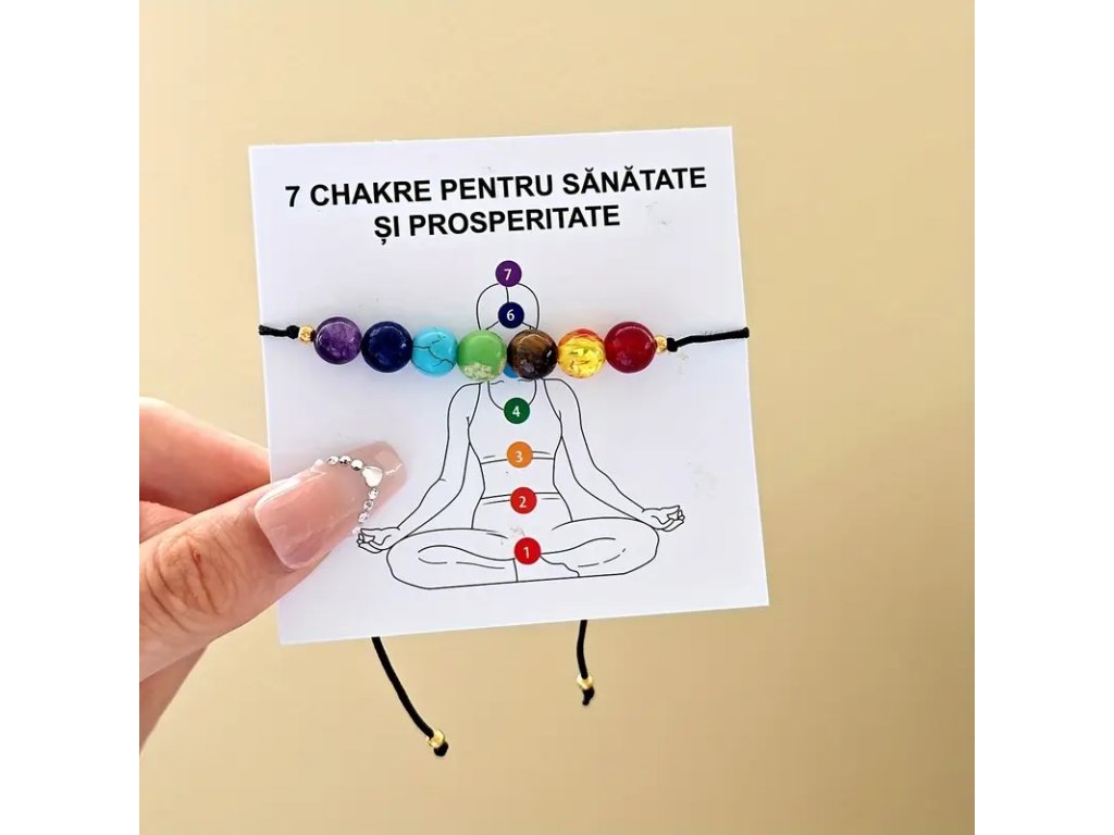 Náramek na papírové kartě se 7 barevnými korálky v barvách čaker je doplněn 2 zlatými korálky a uzlíky, aby se korálky nepohybovaly. Na konci šňůrek jsou přidány další 2 zlaté korálky.
