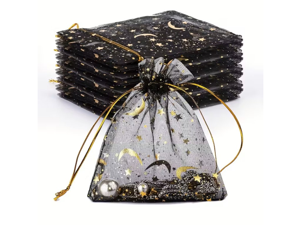 Dárkový sáček je vyrobený z černé organzy a zdobí ho měsíc a hvězdy ve zlato-stříbrné barvě. Snadno se uzavírá pomocí dvou zlatých stahovacích šňůrek. Stačí je zatáhnout od sebe, případně konce můžete uvázat do mašličky.