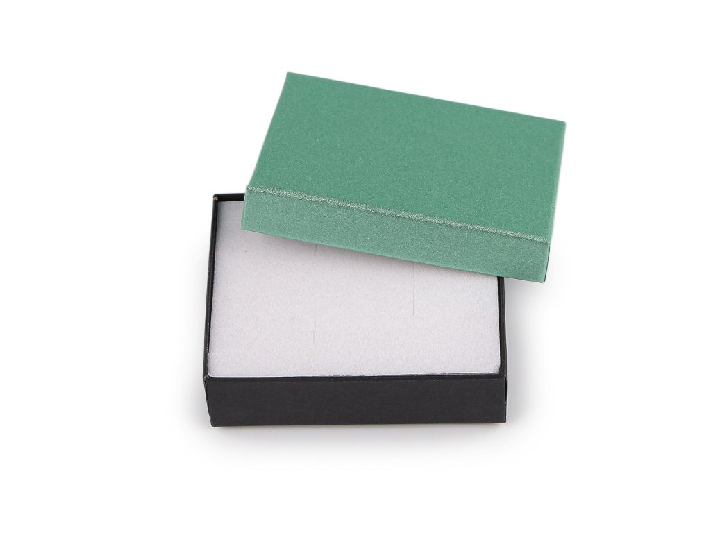 Papírová krabička s poutavým třpytivým leskem. Uvnitř je klasická bílá molitanová výplň s průřezem na řetízek s přívěskem, náušnice a prsten, která se dá vyjmout. Do krabičky můžete zabalit i jiné drobné dárky.