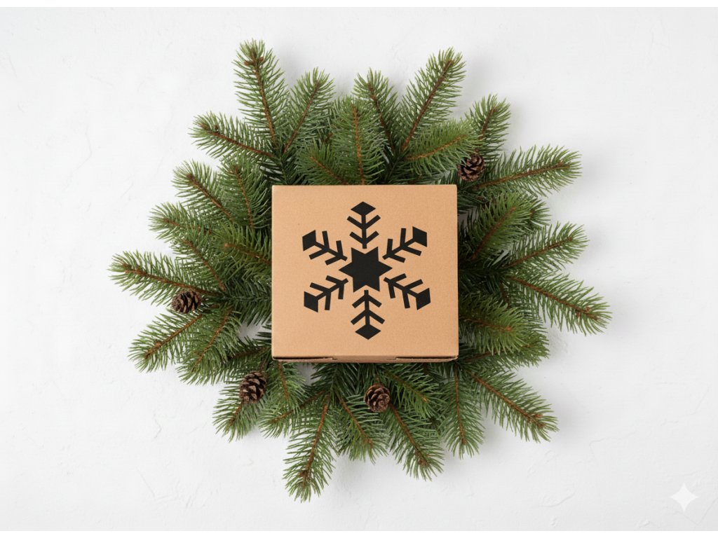 Dárková papírová krabička v přírodní hnědé barvě má ve víku plastový průhled s motivem sněhové vločky. Její rozměr je 10*10 cm, výška 6.5 cm.