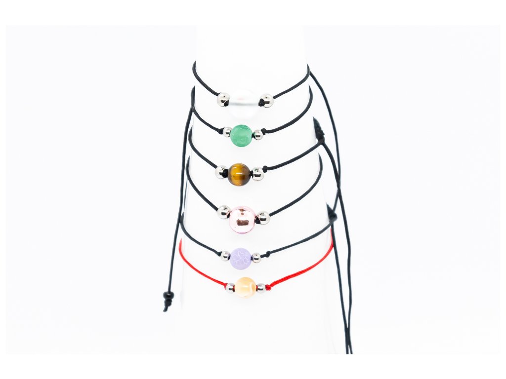 S 1 středovým minerálem velikosti 8 mm doplněný z obou stran 2 nerezovými korálky a na konci šňůrek černými plastovými korálky.