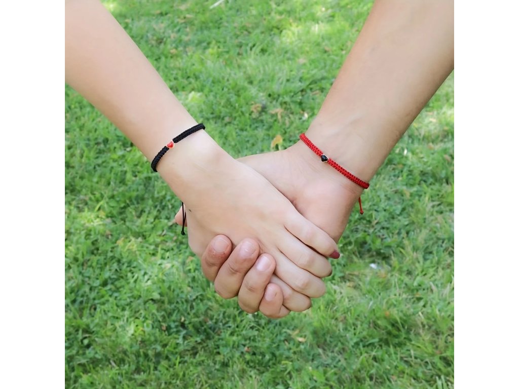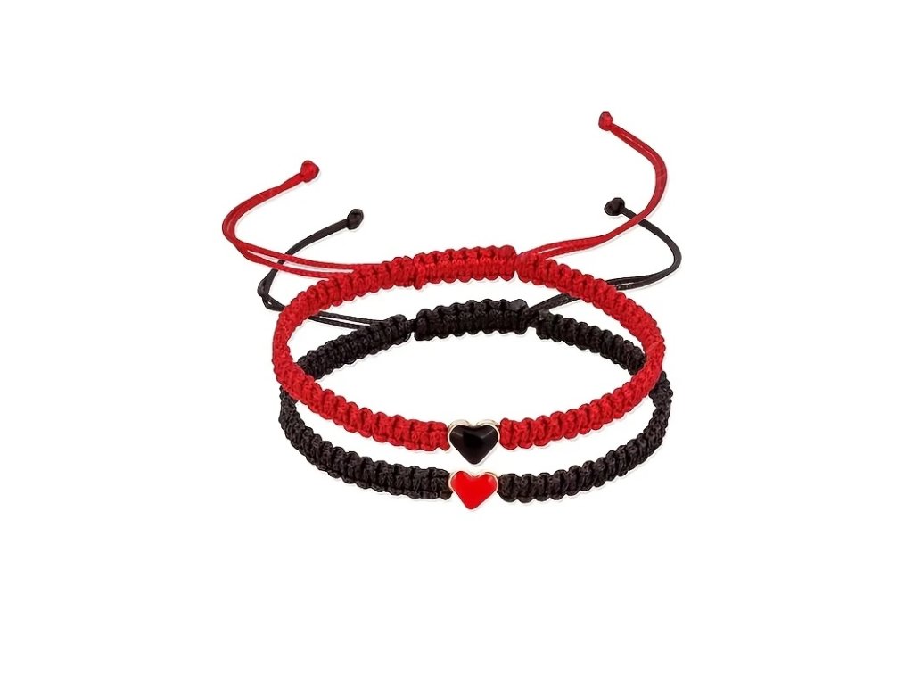 Náramek z červené šňůrky má černé srdíčko ve zlatém ohraničení, naopak náramek z černé šňůrky má červené srdíčko ve zlatém ohraničení. Přívěsky jsou z bižuterního kovu .