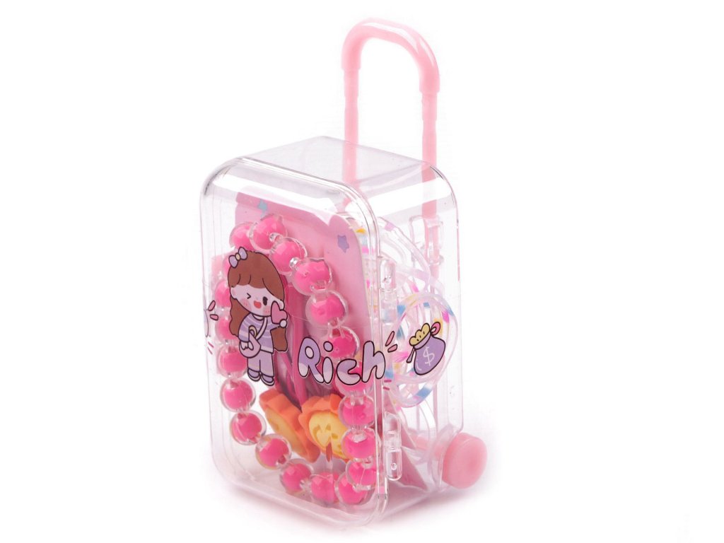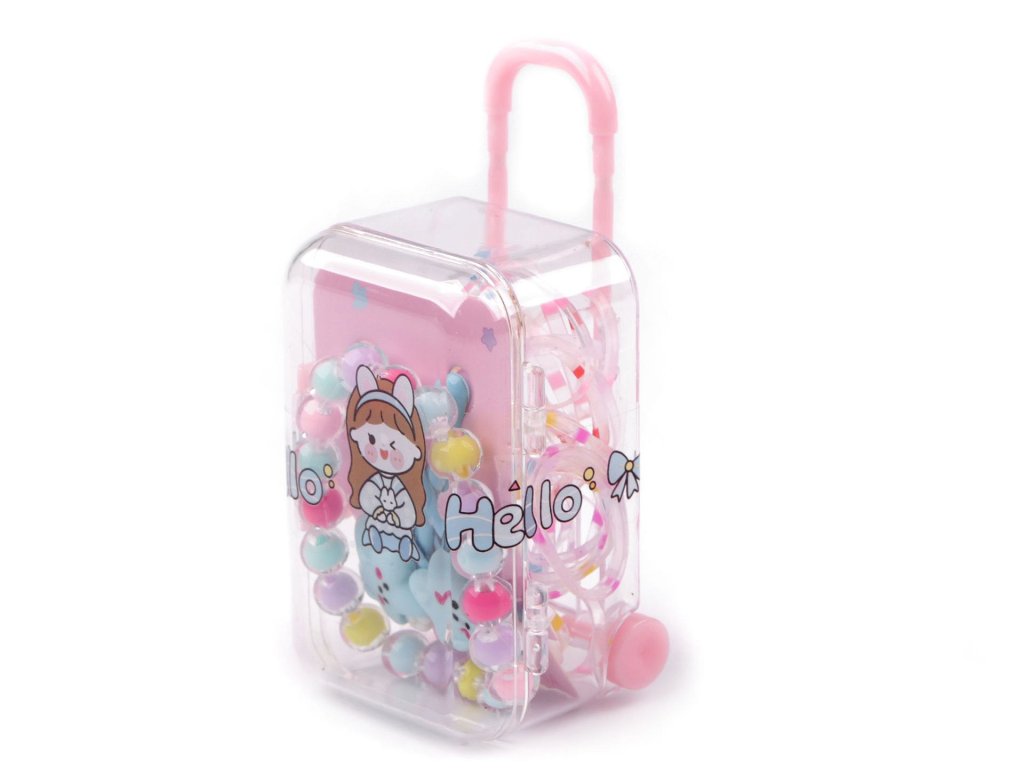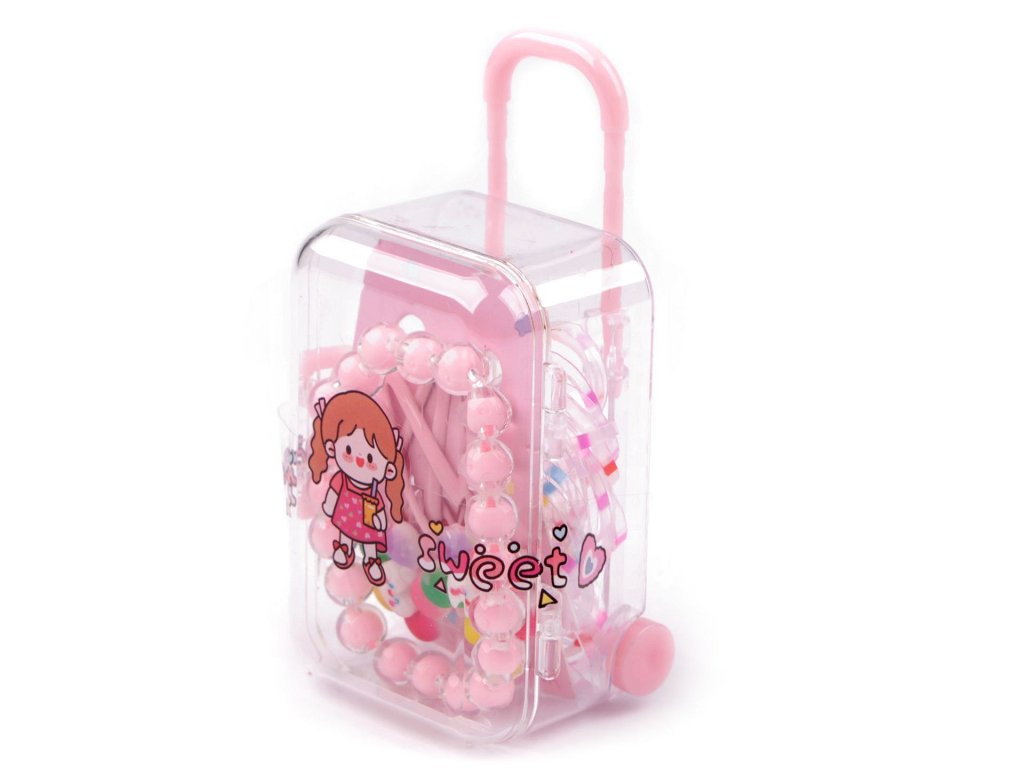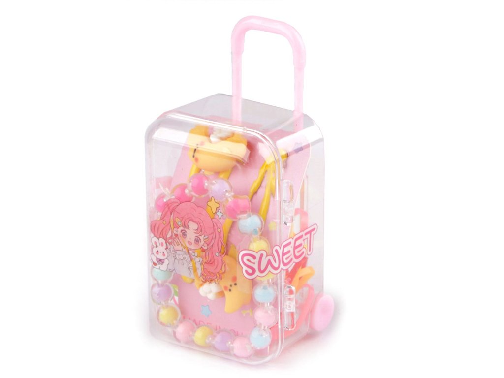 Sada dětských šperků je ideální pro holčičky, které se rády parádí. Vše je uschováno v otevíracím plastovém boxu ve tvaru pojízdného kufru.