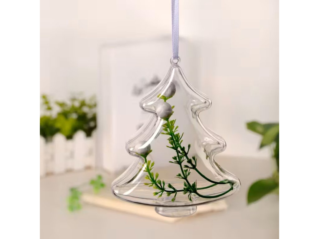 Průhledný plastový stromeček se skládá ze dvou zaklapávacích dílů, které lze spojit a pomocí očka zavěsit jako dekoraci. Stromeček lze použít jako finální krabičku nebo s ním můžete pracovat jako s polotovarem, který jej lze dozdobit např. obháčkováním nebo dobarvením, atd.