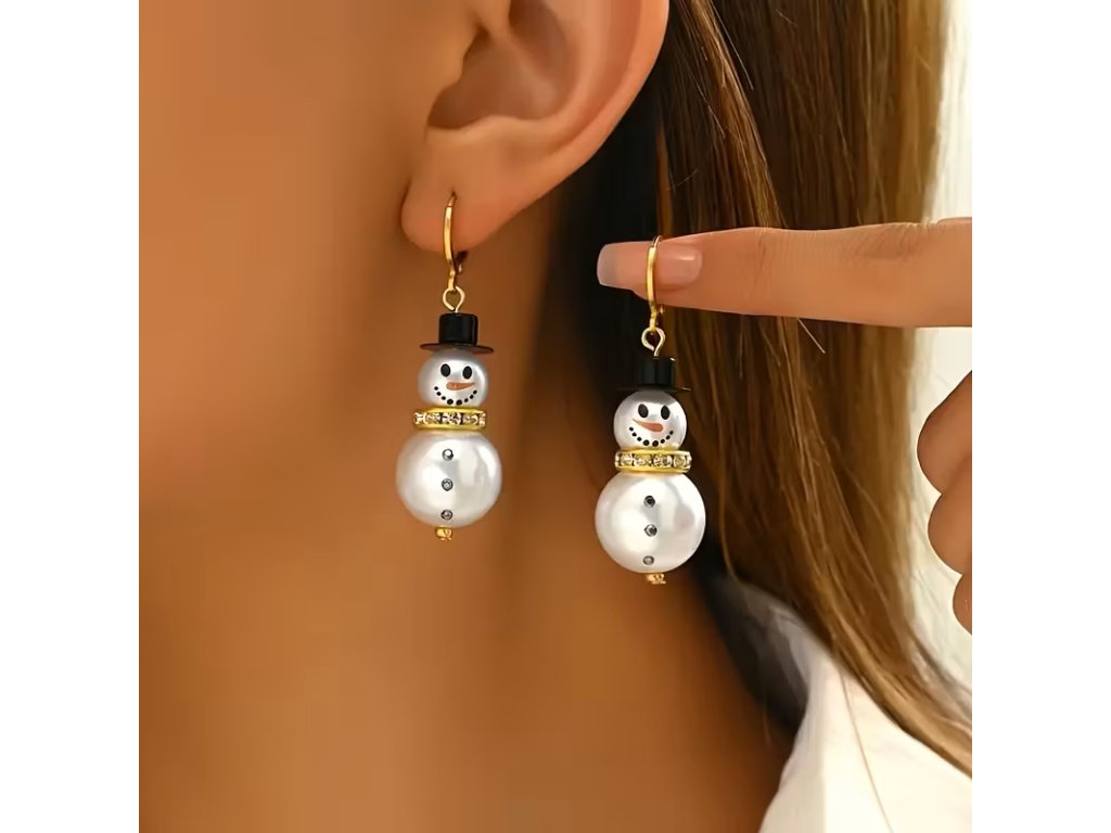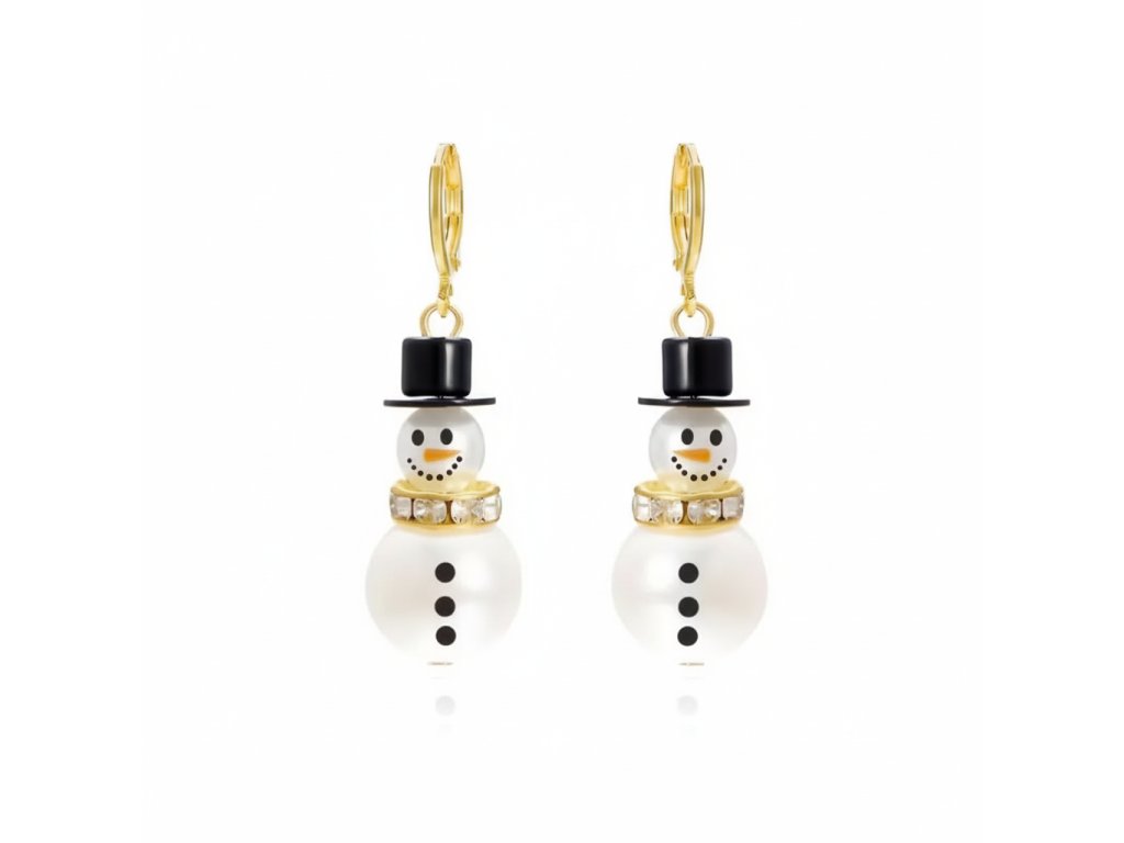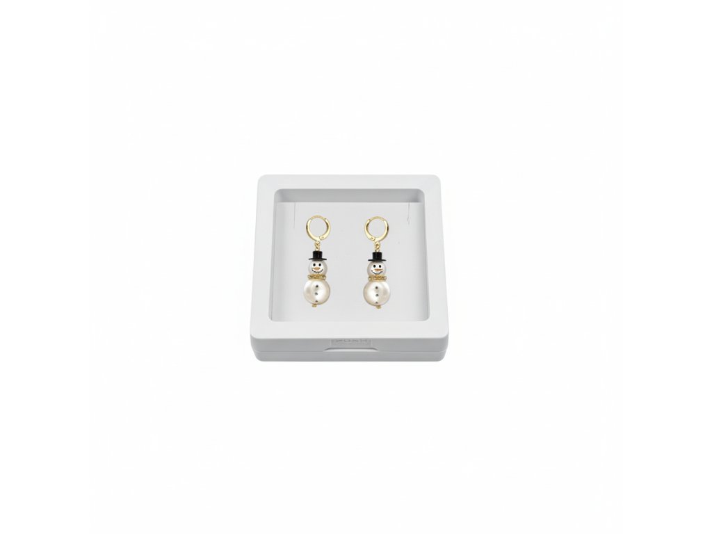 Sněhuláček sestává ze dvou bílých kouliček pomalovaných jako typický sněhulák. Mezi kouličkami je zlatý kroužek s třpytivými kamínky. Sněhuláček má na hlavě černý klobouček .Náušnice jsou zacvakávací. Jsou z bižuterního kovu.